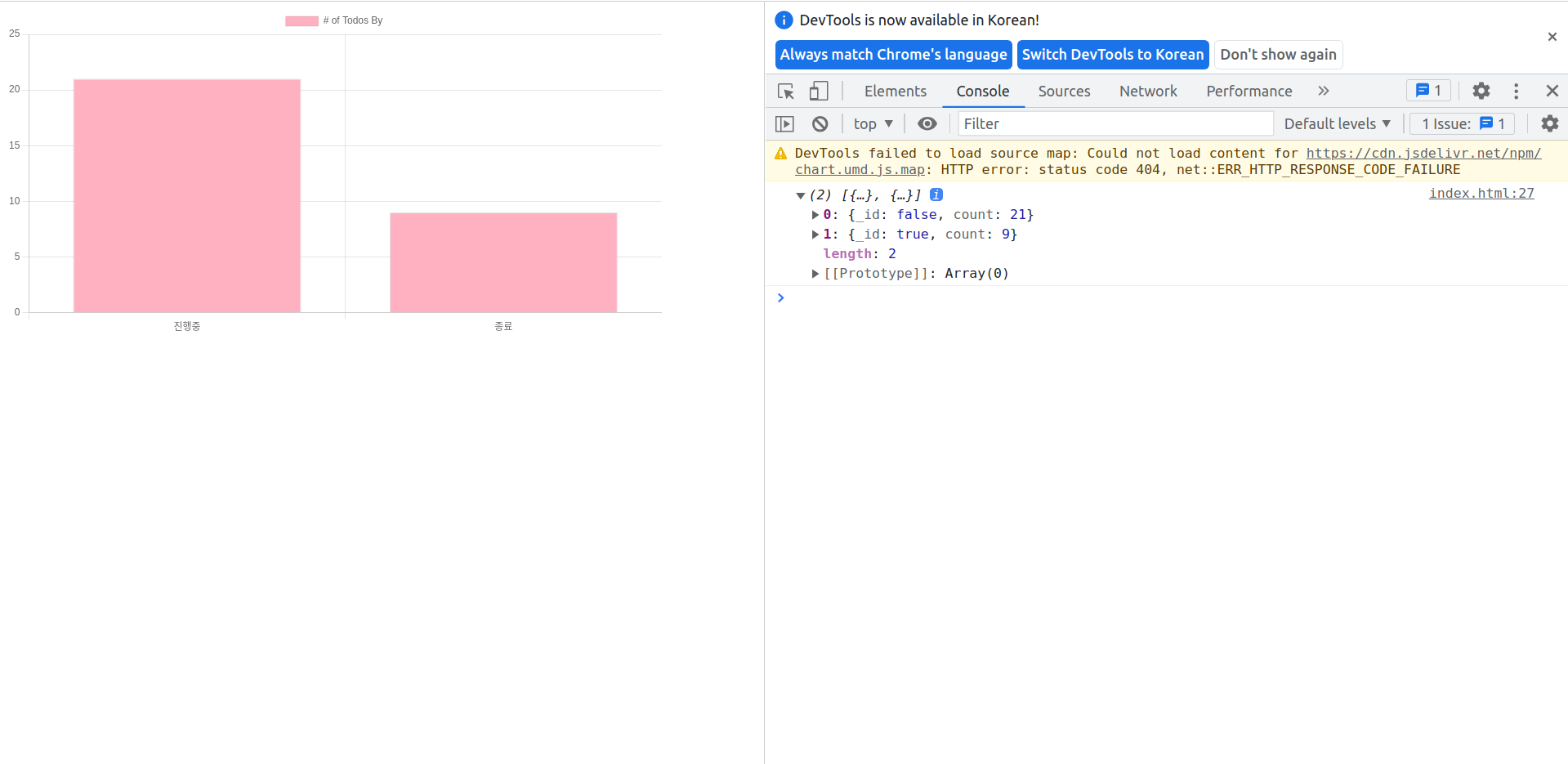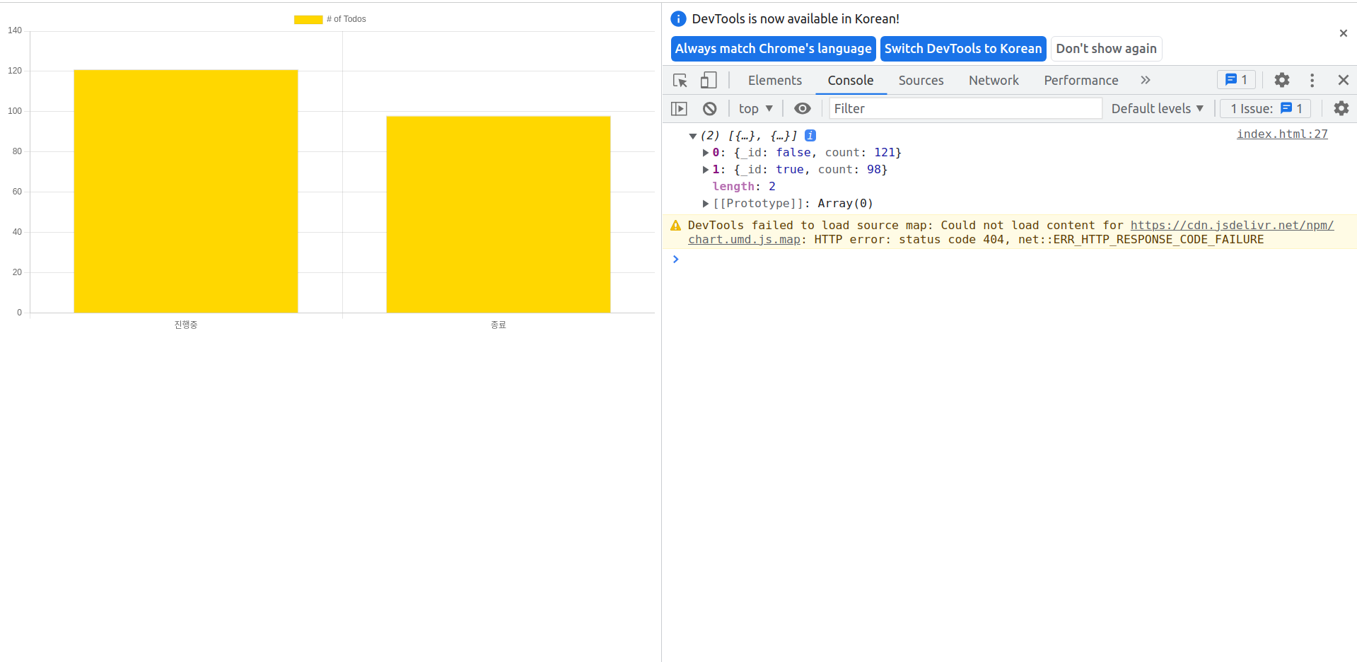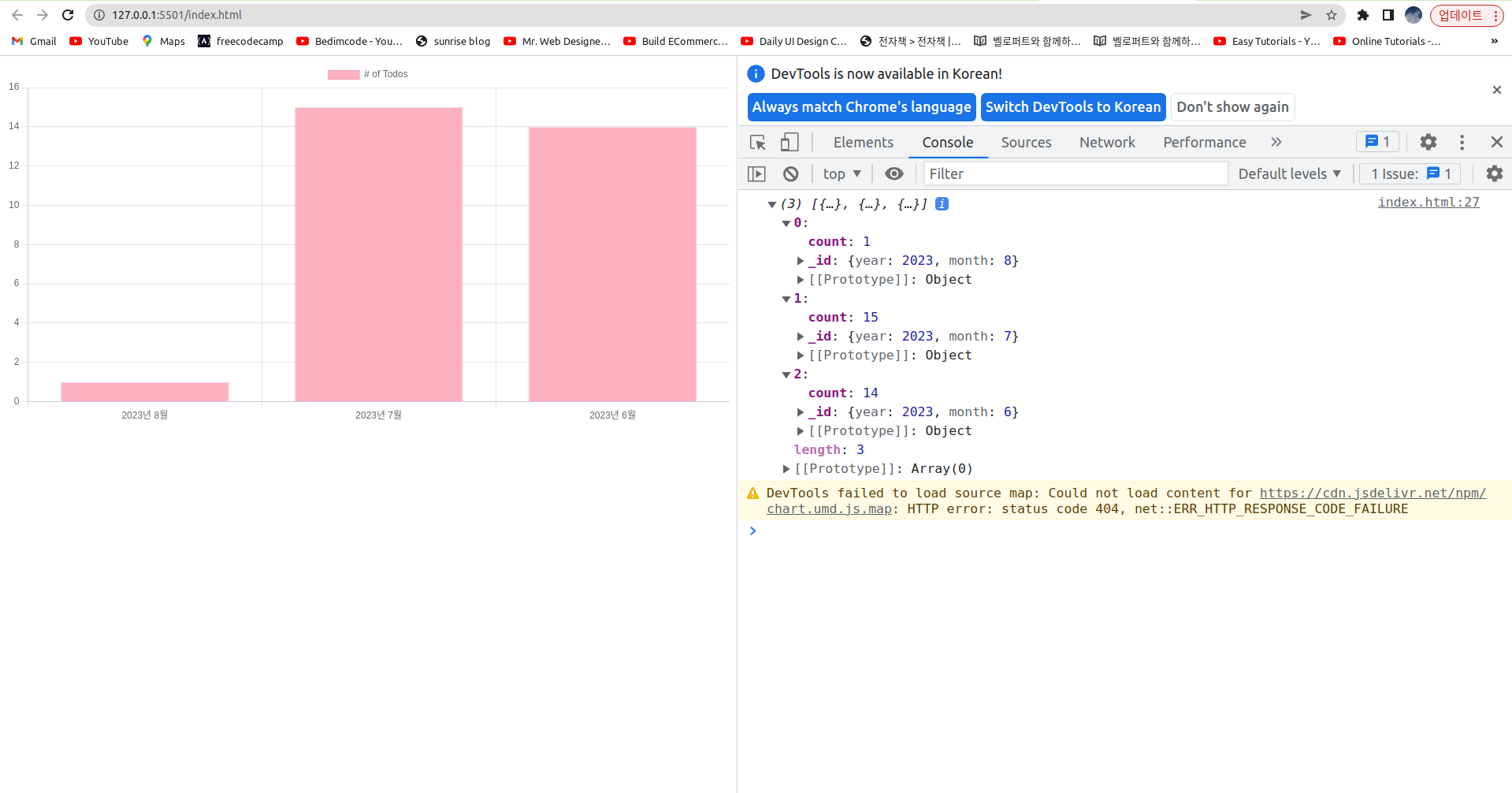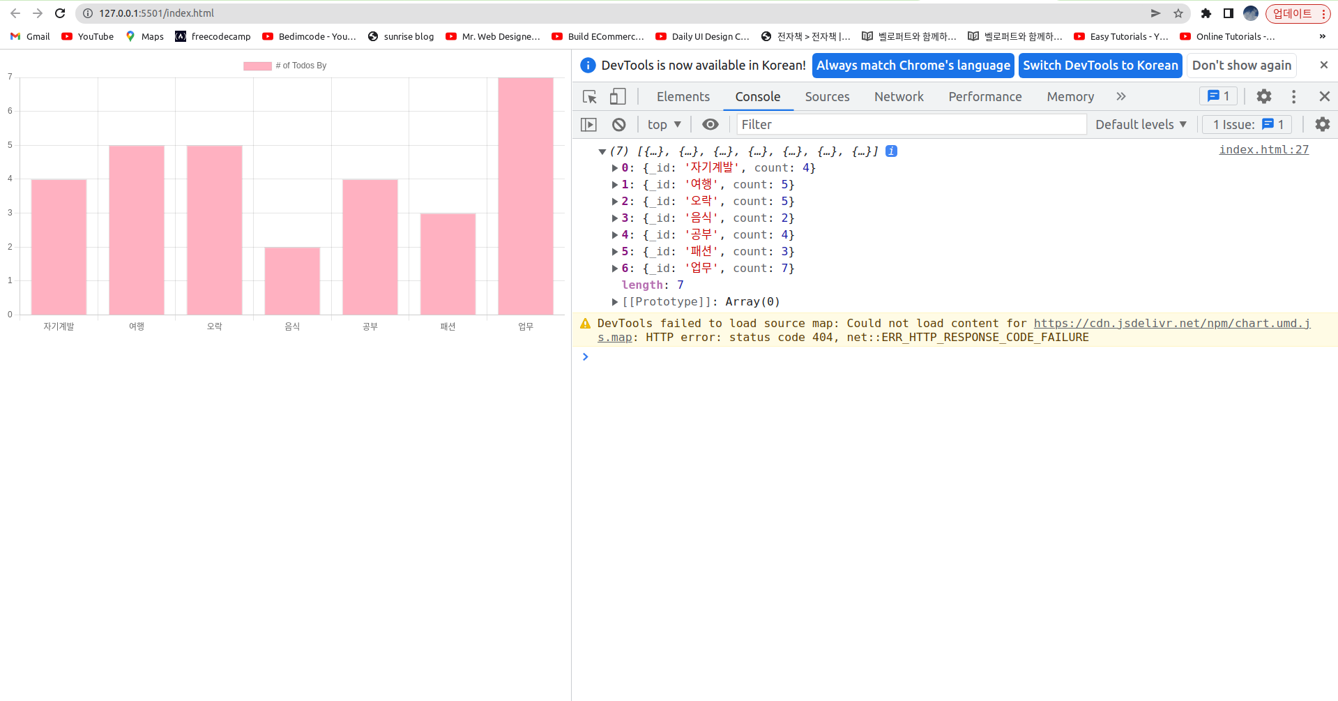 할일목록(TODO) 앱 5 - chart.js 로 그룹핑한 데이터 그래프로 그리기프로젝트/할일목록(TODO) 앱 2023. 8. 9. 01:34728x90