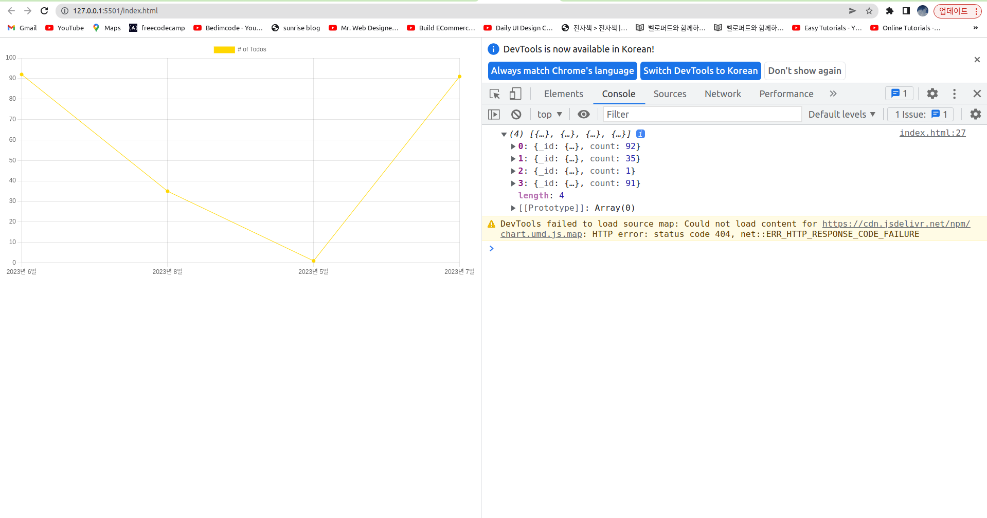 chart.js - 전체 할일목록 종료날짜별 그룹핑 만약 날짜별 정렬이 제대로 되어 있지 않으면 프론트쪽 코드에서 then 메서드 안에서 아래 코드를 추가한다.